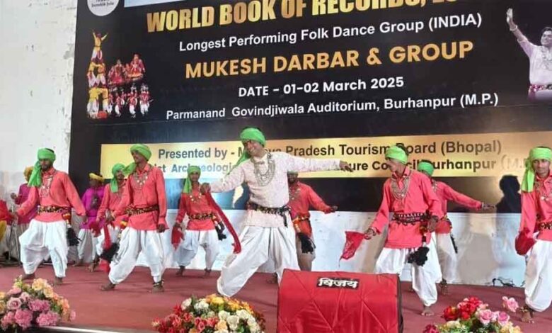 बिना रुके लगातार चौबीस घंटे लोक नृत्य कर वर्ल्ड बुक ऑफ रिकार्ड लंदन में नाम दर्ज कराने के लिए शनिवार से बुरहानपुर के परमानंद गोविंदजीवाला आडिटोरियम में लोक कलाकार मुकेश दरबार सहित दस कलाकारों का दल मंच पर उतर गया है।